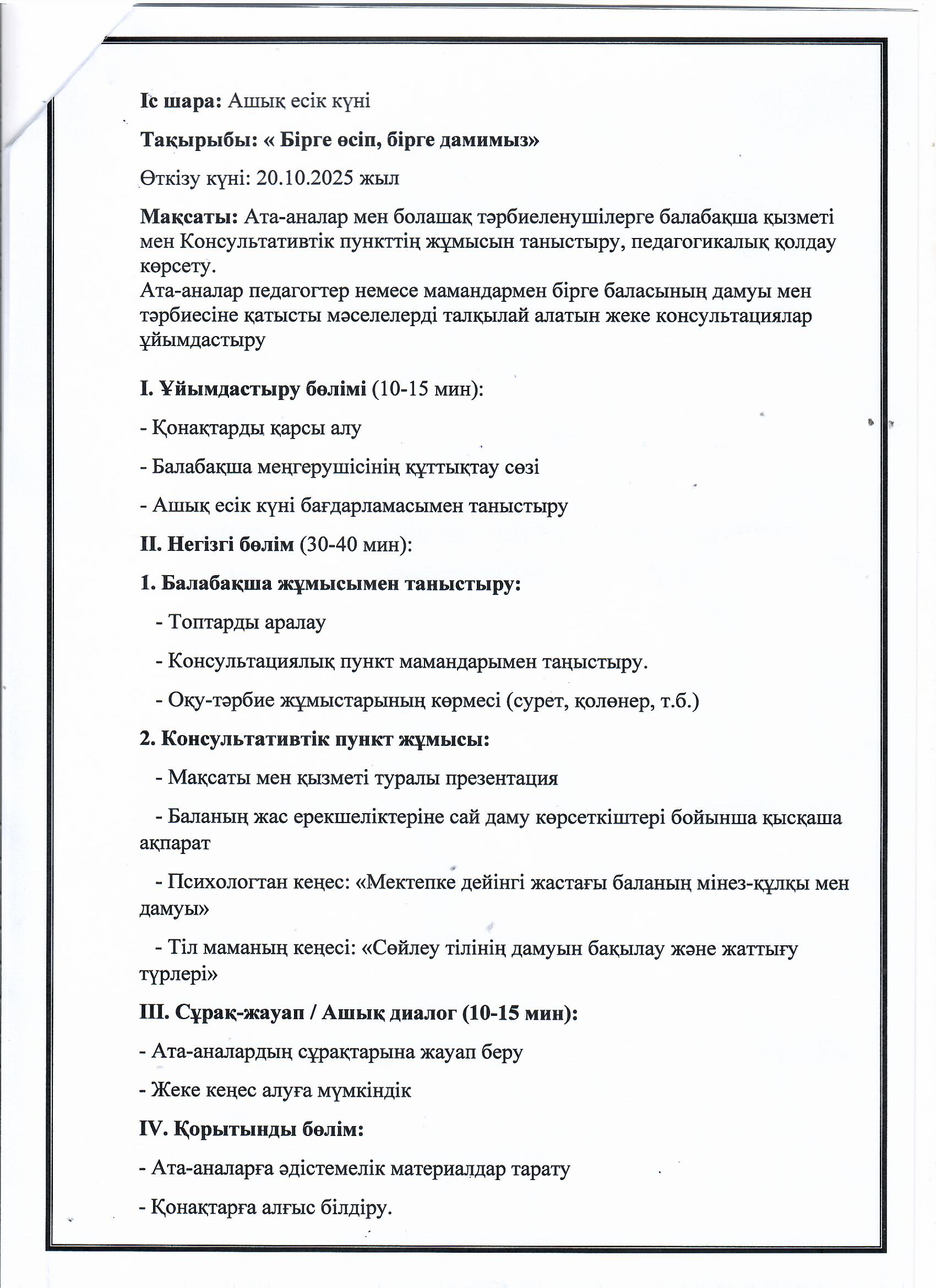 » Ашық есік күніне арналған консультативтік пункт жұмысының жоспары