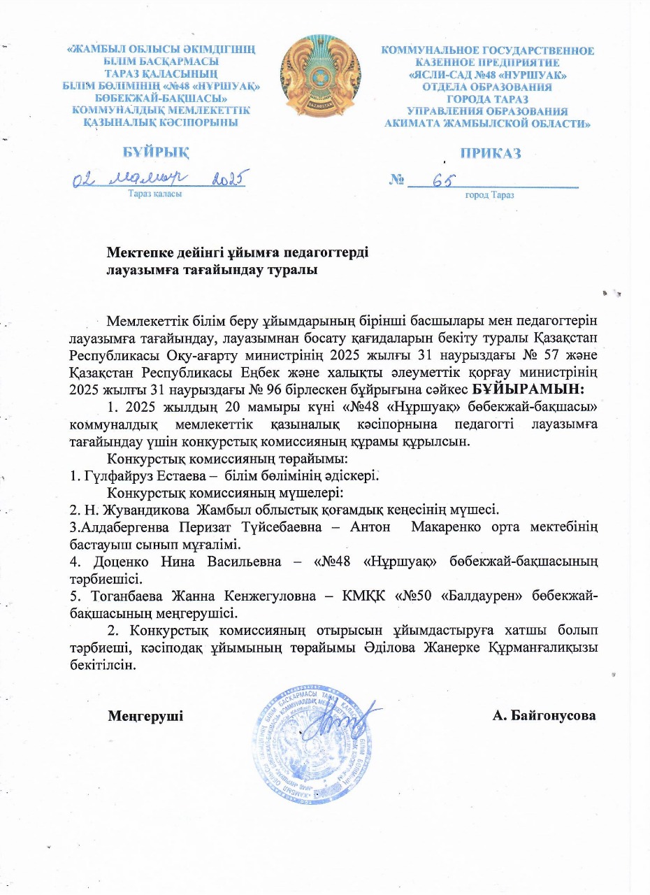 Мектепке дейінгі ұйымға педагогтерді лауазымға тағайындау туралы