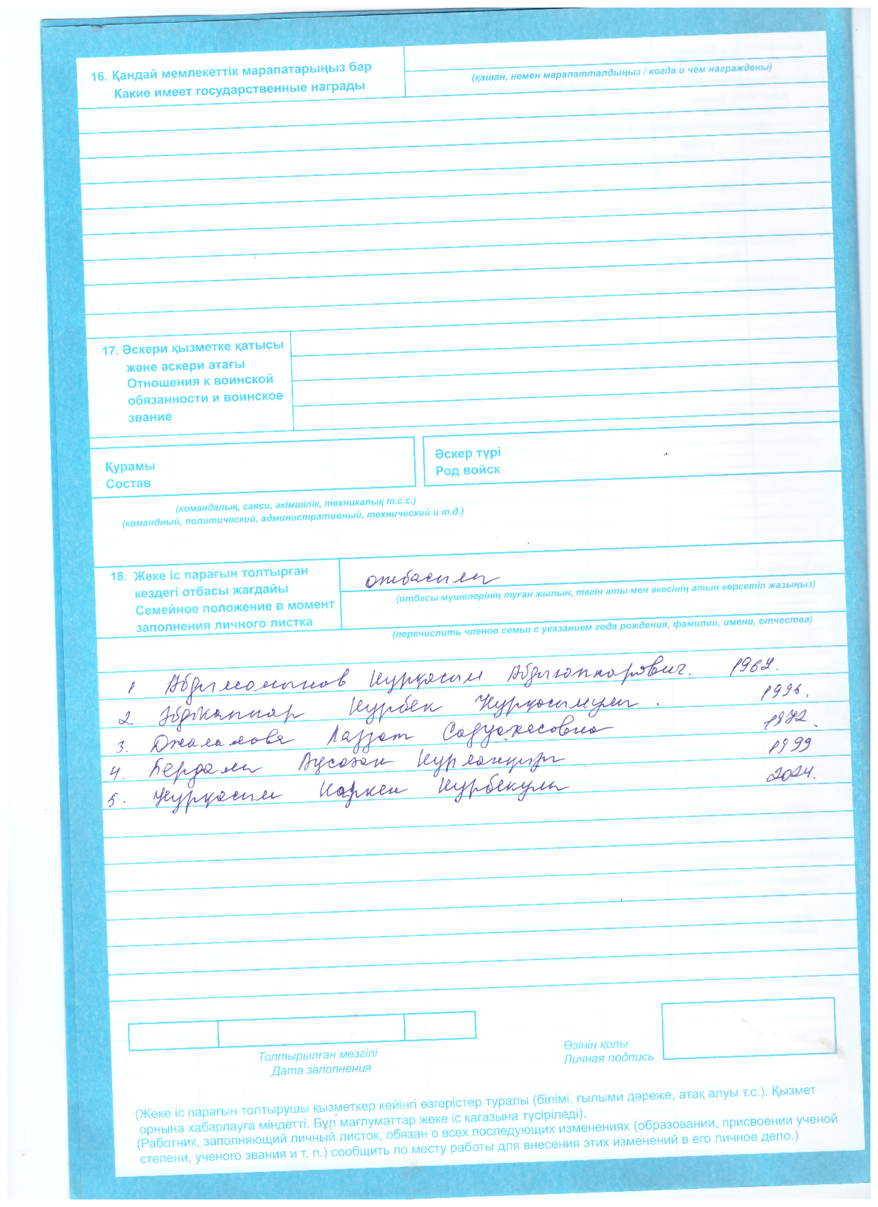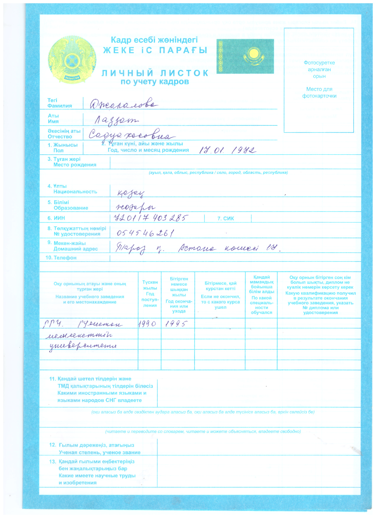 24 июль 2025 0 1 2 3 4 5 Қағиданың 113-тармағында көрсетілген құжаттар тізбесі: 3) Кадрларды есепке алу бойынша толтырылған жеке іс парағы (нақты тұрғылықты мекенжайы мен байланыс телефондары көрсетілген – бар болса);