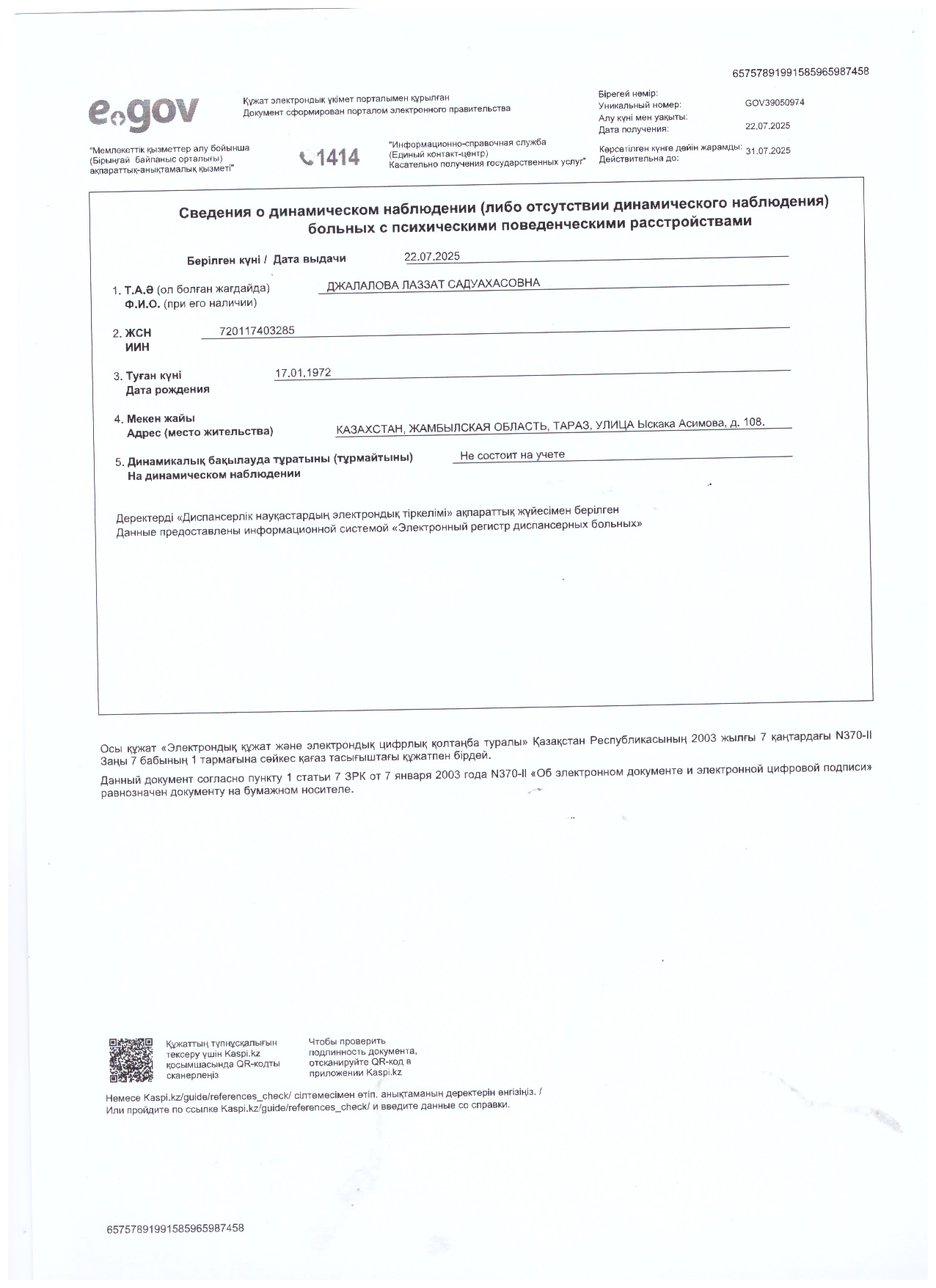 24 июль 2025 0 1 2 3 4 5 Қағиданың 113-тармағында көрсетілген құжаттар тізбесі Психикалық, мінез-құлықтық бұзылушылықтары бар аурудың динамикалық бақылауда жоқтығы туралы анықтама