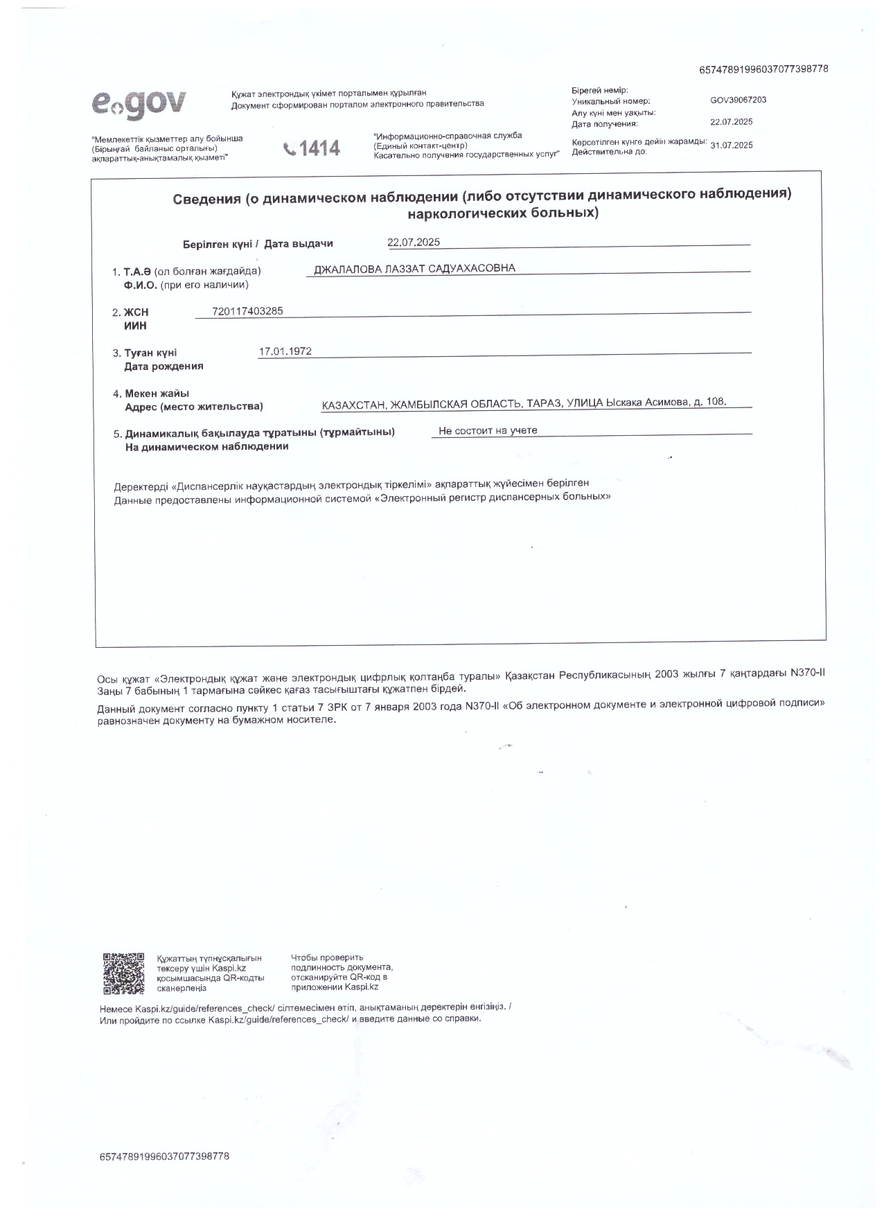 24 июль 2025 0 1 2 3 4 5 Қағиданың 113-тармағында көрсетілген құжаттар тізбесі: Наркологиялық аурудың динамикалық бақылауда жоқтығы туралы анықтама
