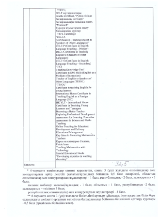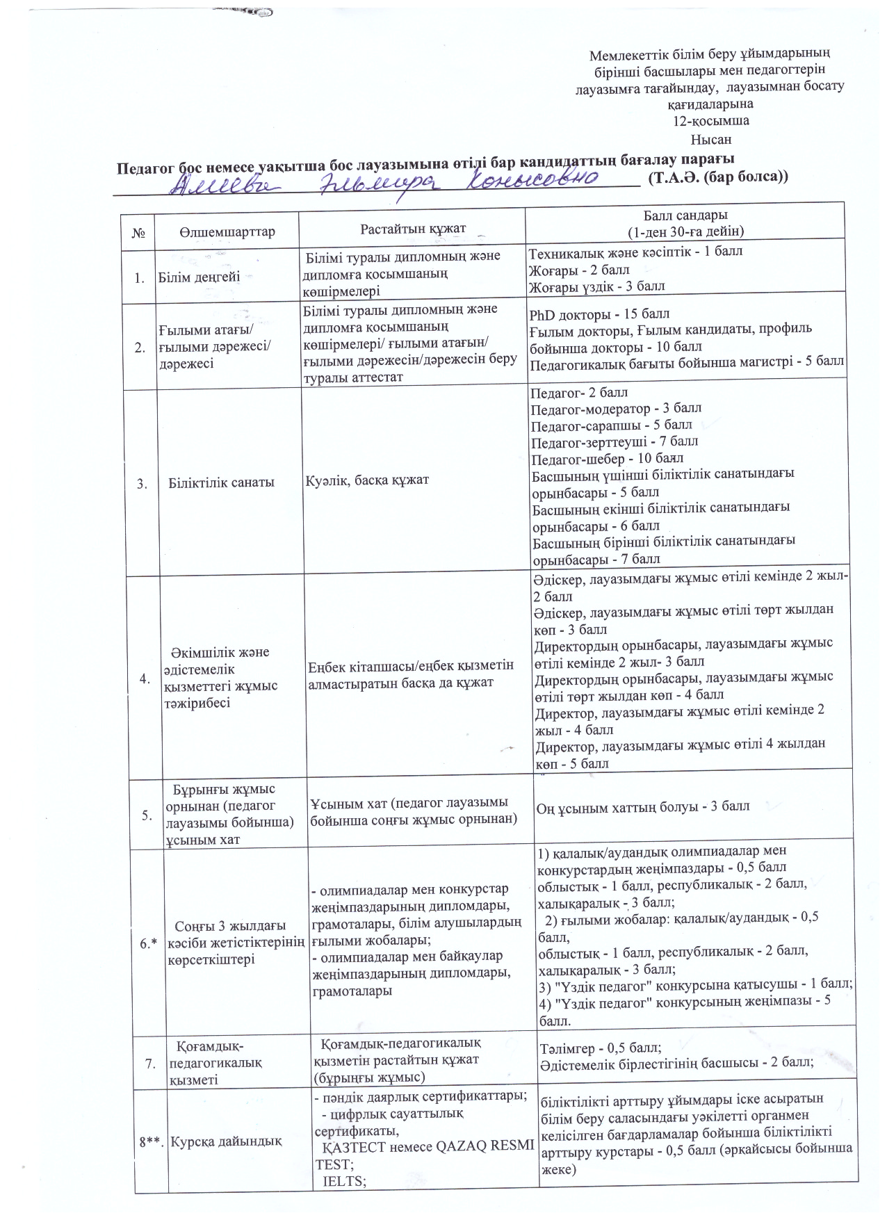 02 июль 2025 0 1 2 3 4 5 Қағиданың 113-тармағында көрсетілген құжаттар тізбесі: Қағидадағы 12, 13-қосымшаларға сәйкес нысан бойынша педагогтің бос немесе уақытша бос лауазымына кандидаттың толтырылған бағалау парағы
