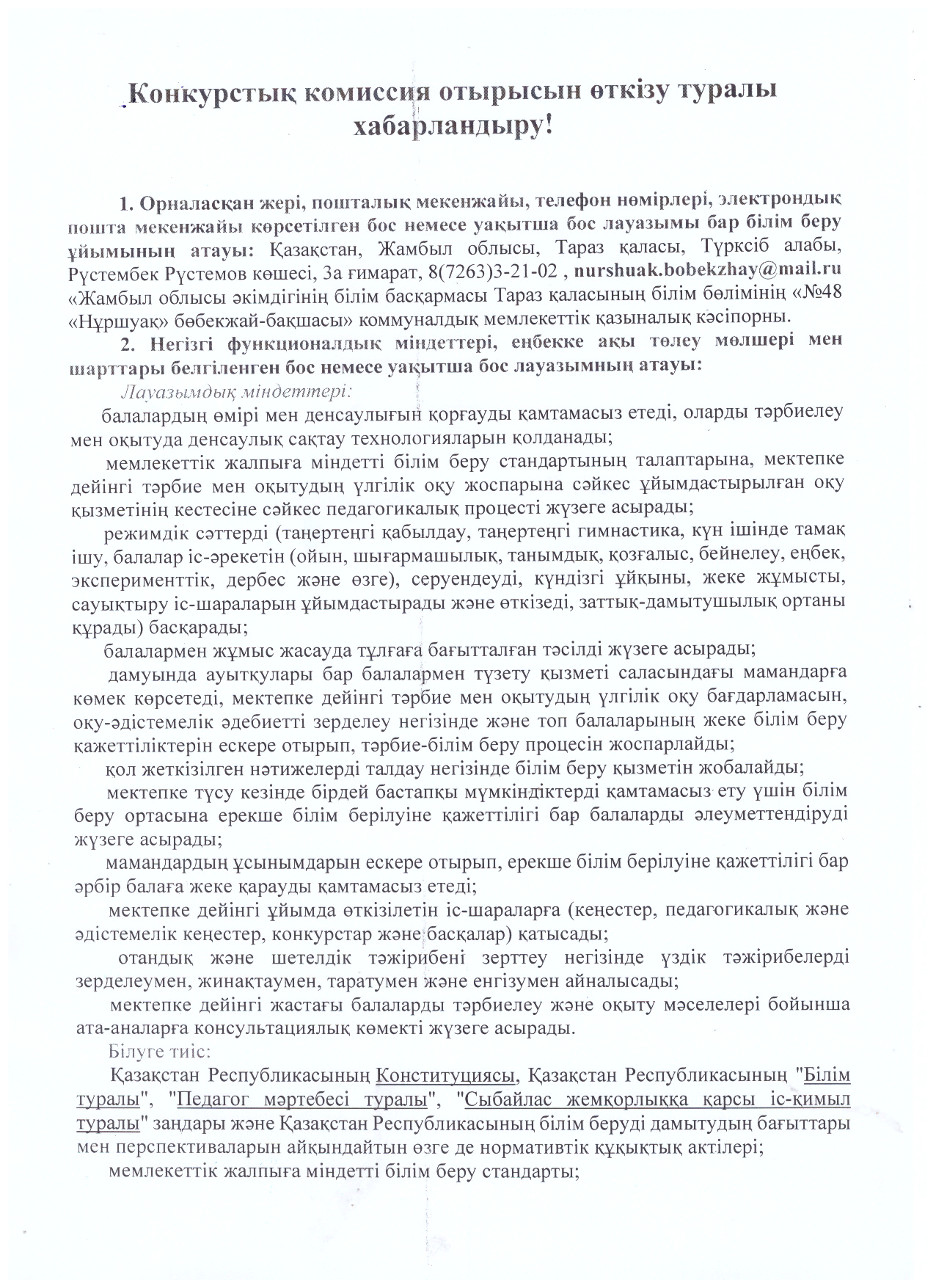 » Конкурстық комиссия отырысын өткізу туралы хабарландыру!