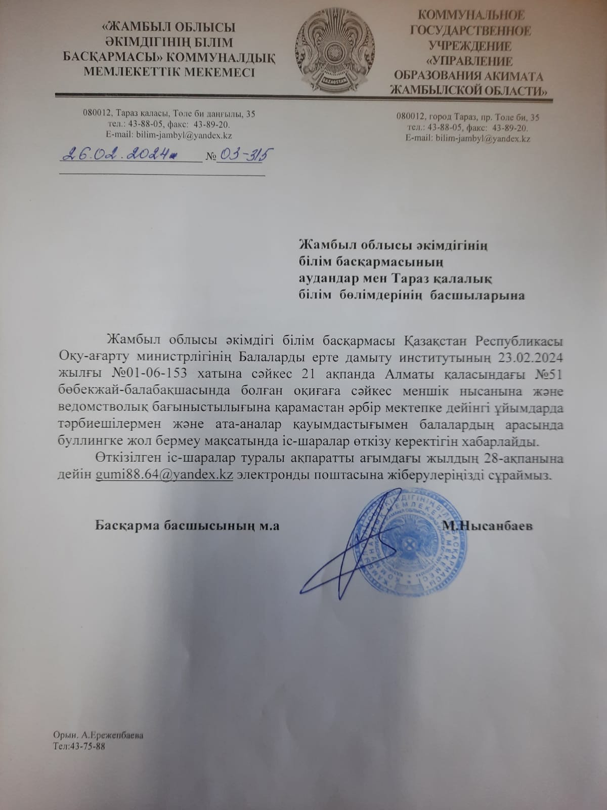 Жамбыл облысы әкімдігі білім басқармасы Қазақстан Республикасы Оқу-ағарту министрігінің Балаларды ерте дамыту институтының 23.02.2024 жылғы №01-06-153 хатына сәйкес 21 ақпанда Алматы қаласындағы №51 бөбекжай-бақшасында болған оқиғаға сәйкес меншік нысанына және ведомстволық бағыныстылығына қарамастан әрбір мектепке дейінгі ұйымдарда тәрбиешілермен және ата-аналар қауымдыстығымен балалардың арасында буллингке жол бермеу мақсатында «Нұршуақ» бөбекжай-бақшасында» хатына сәйкес, түсіндірме жұмыстары жүргізілді.