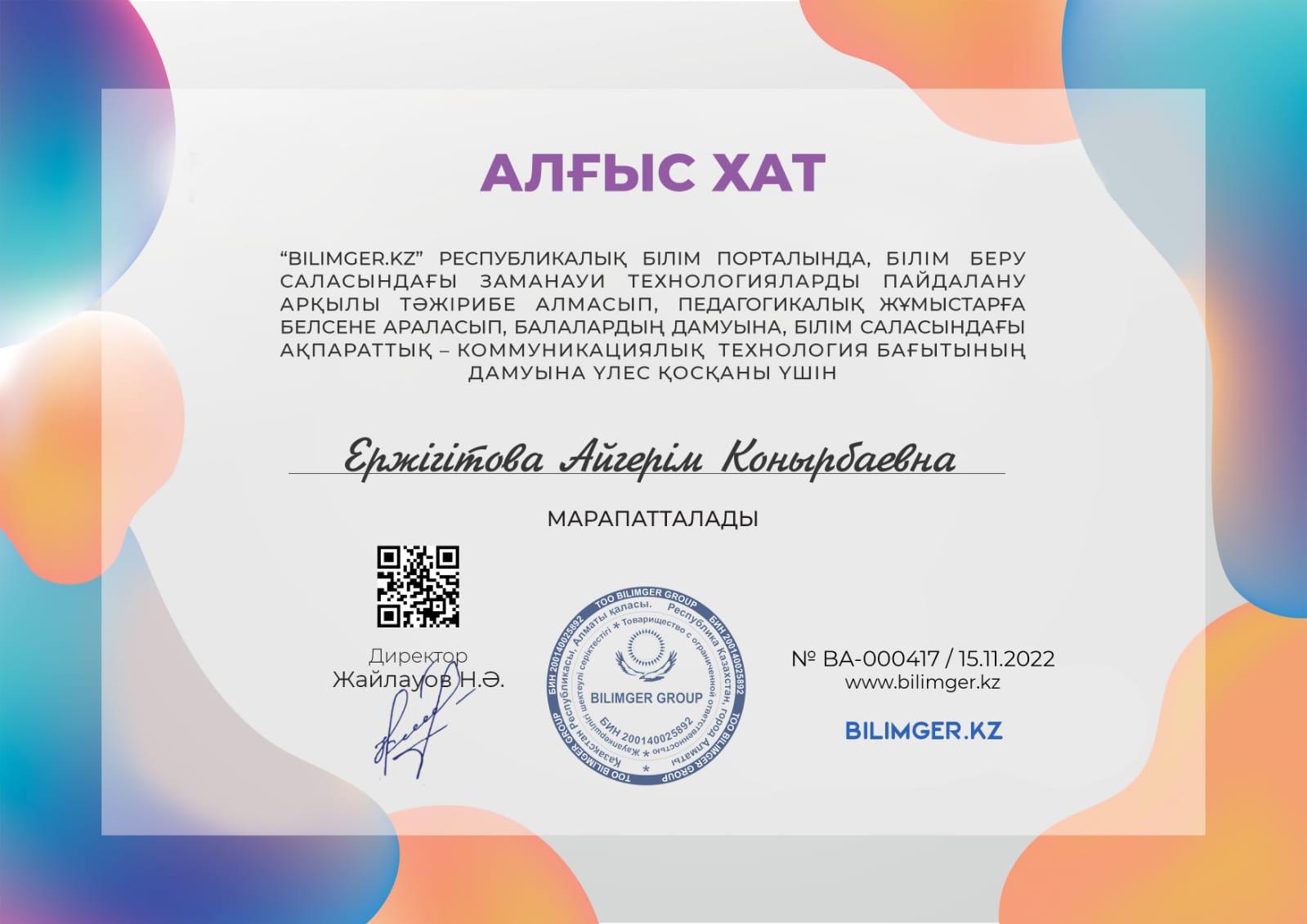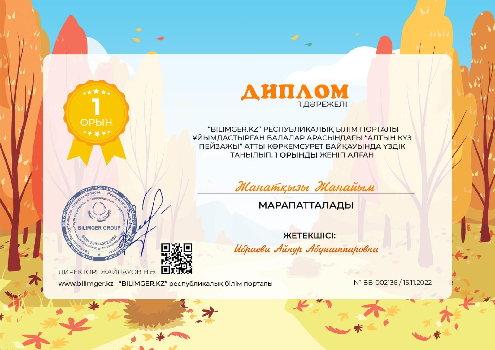 09 ноябрь 2022 0 1 2 3 4 5 "Алтын күз пейзажы " атты Республикалық байқауға Кіші "Жұлдыз" тобының бүлдіршіндері 1орын дипломы мен тәрбиешілері Ержігітова Айгерім Конырбаевна Ибраева Айнұр Абдигаппаровна алғыс хатпен марапатталды