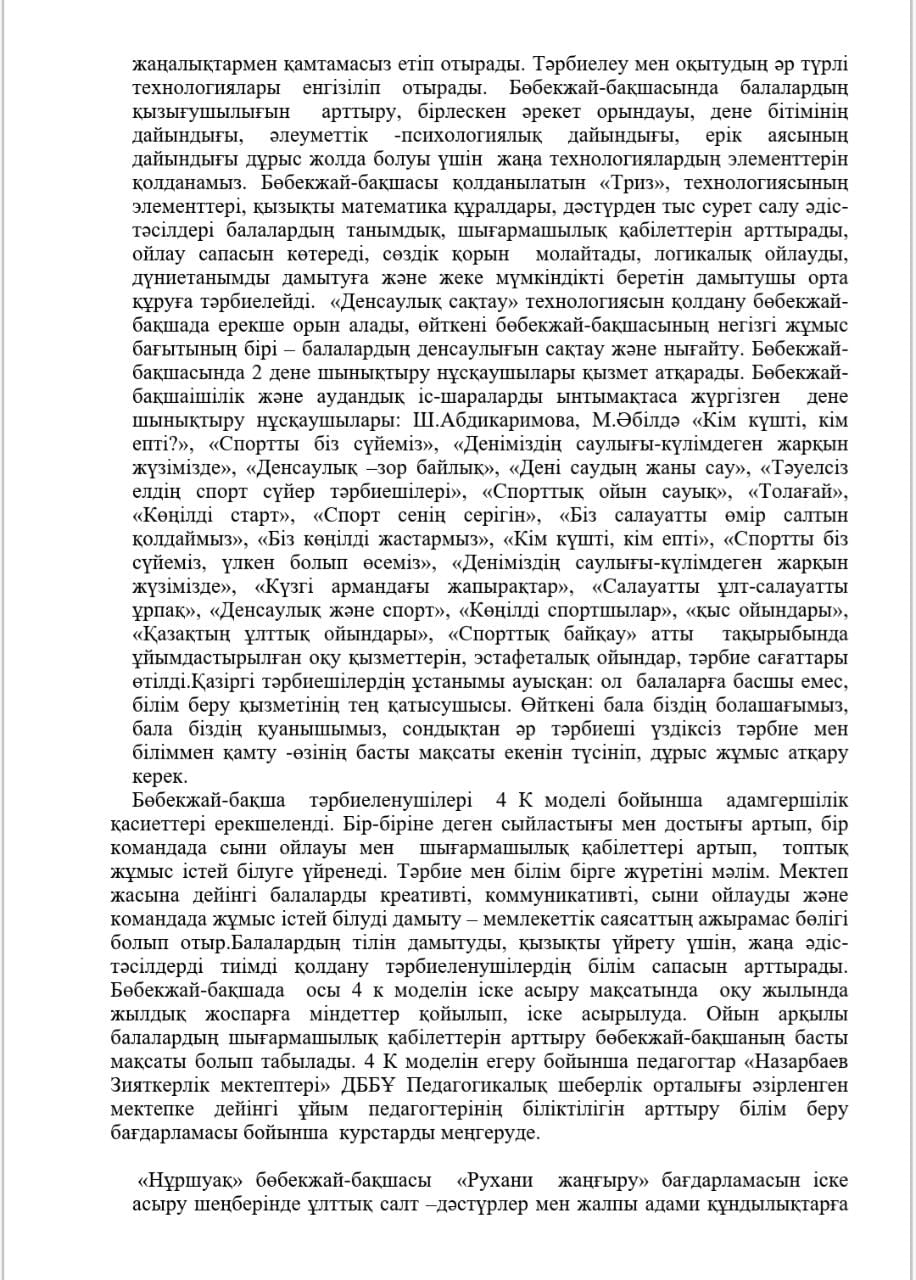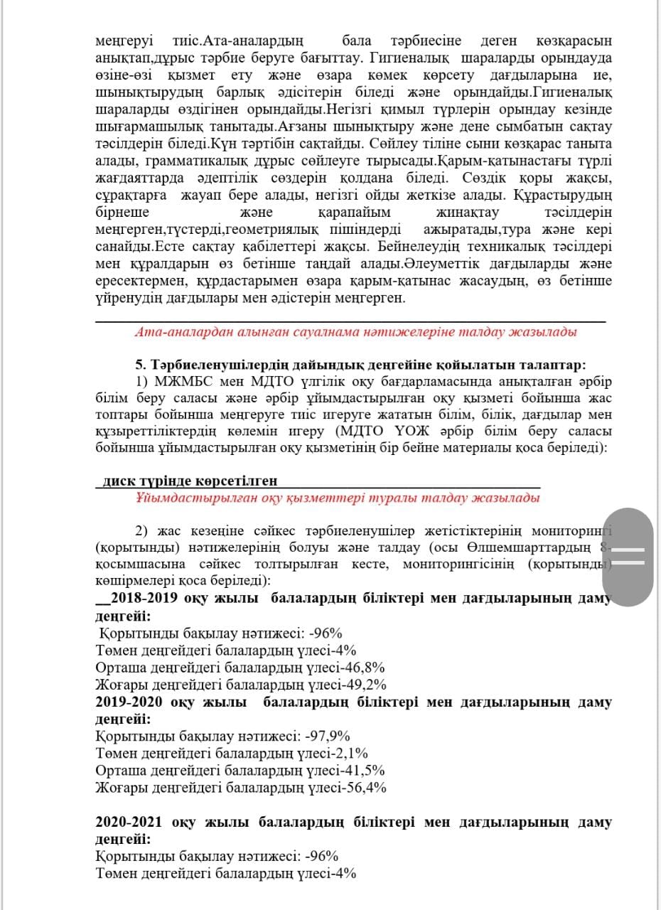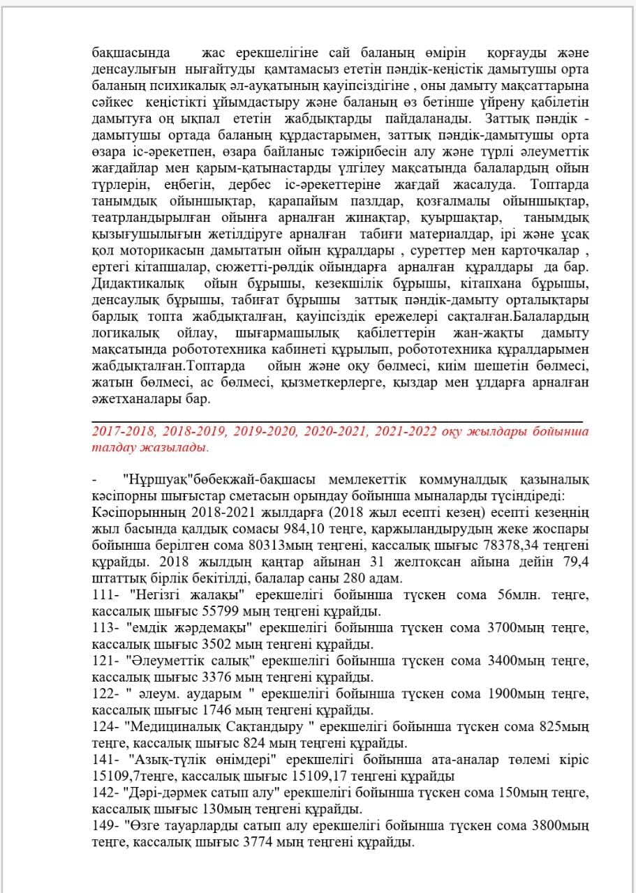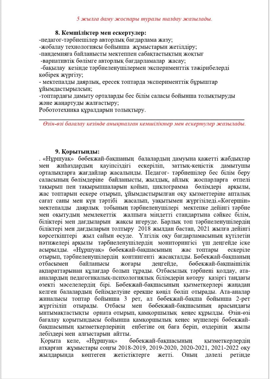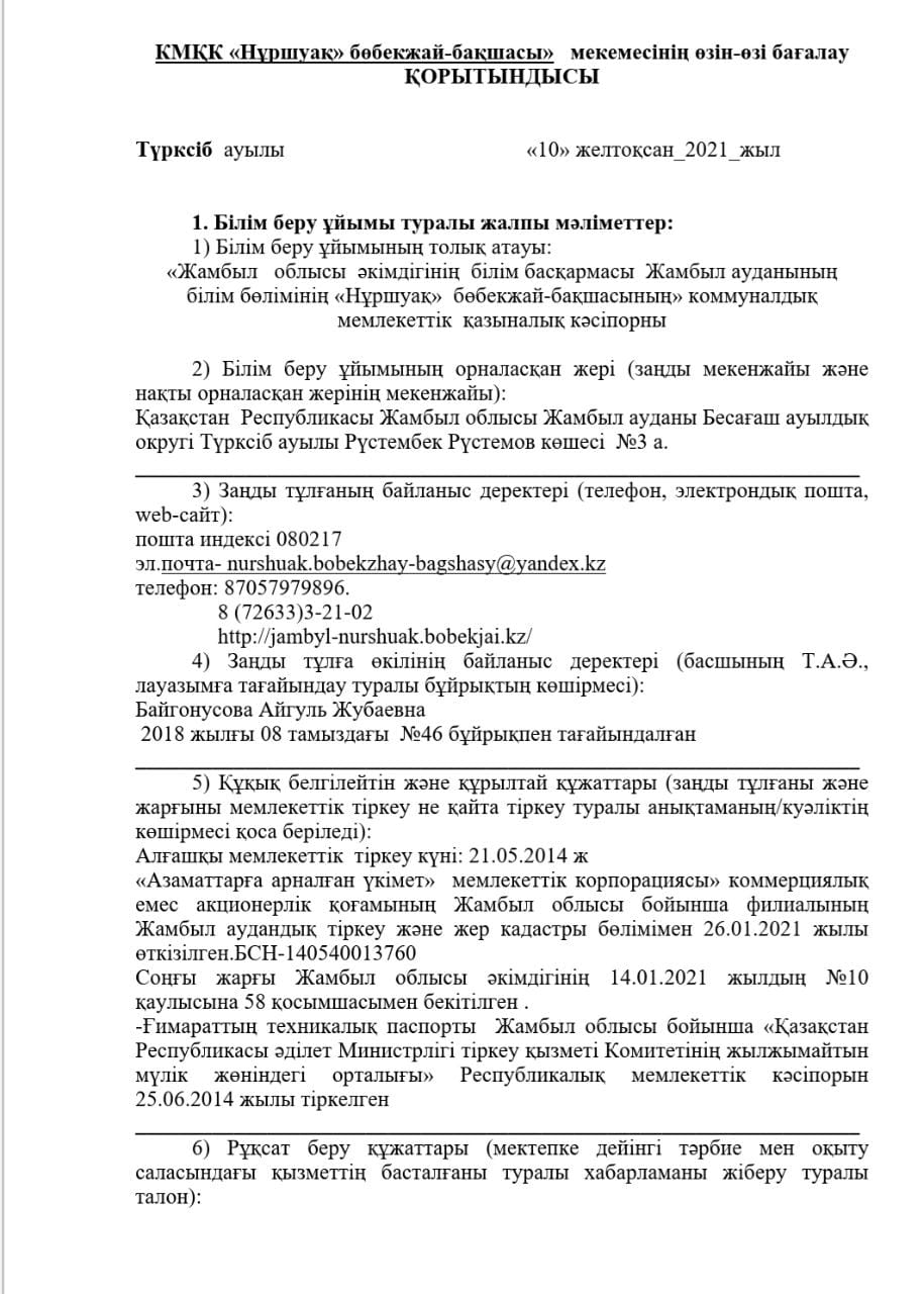 КМҚК "Нұршуақ"бөбекжай-бақшасы" мекемесінің өзін-өзі бағалау ҚОРЫТЫНДЫСЫ