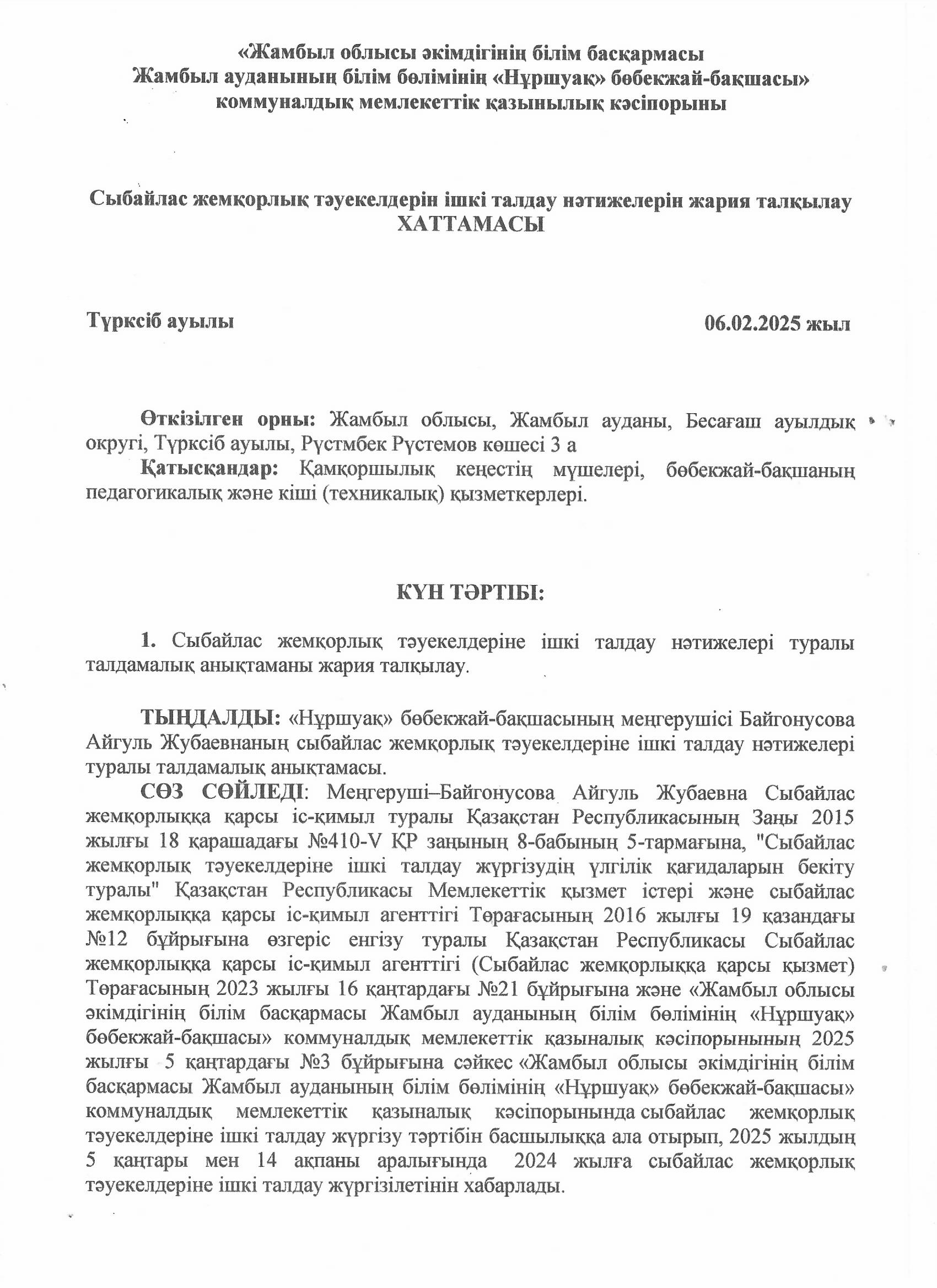 05 январь 2025 0 1 2 3 4 5 Сыбайлас жемқорлыққа қарсы іс-қимыл саласындағы қатынастарды реттеуге арналған отырыстың ХАТТАМАСЫ