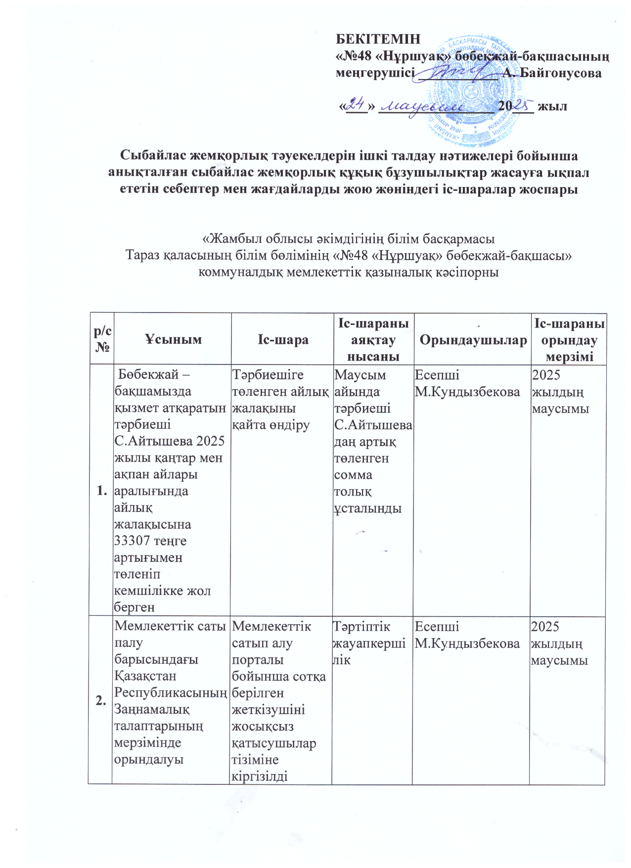 24 июнь 2025 0 1 2 3 4 5 Сыбайлас жемқорлық тәуекелдерін ішкі талдау нәтижелері бойынша анықталған сыбайлас жемқорлық құқық бұзушылықтар жасауға ықпал ететін себептермен жағда